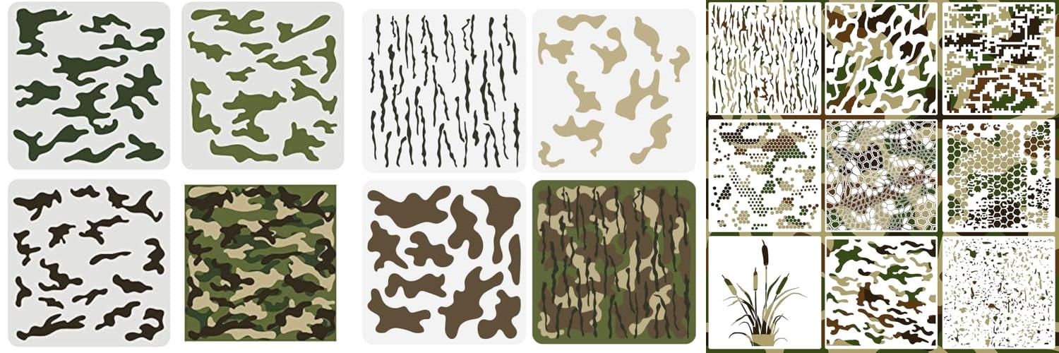 - You get a generous set of 9 stencils, each with different and cool camo and grass designs.