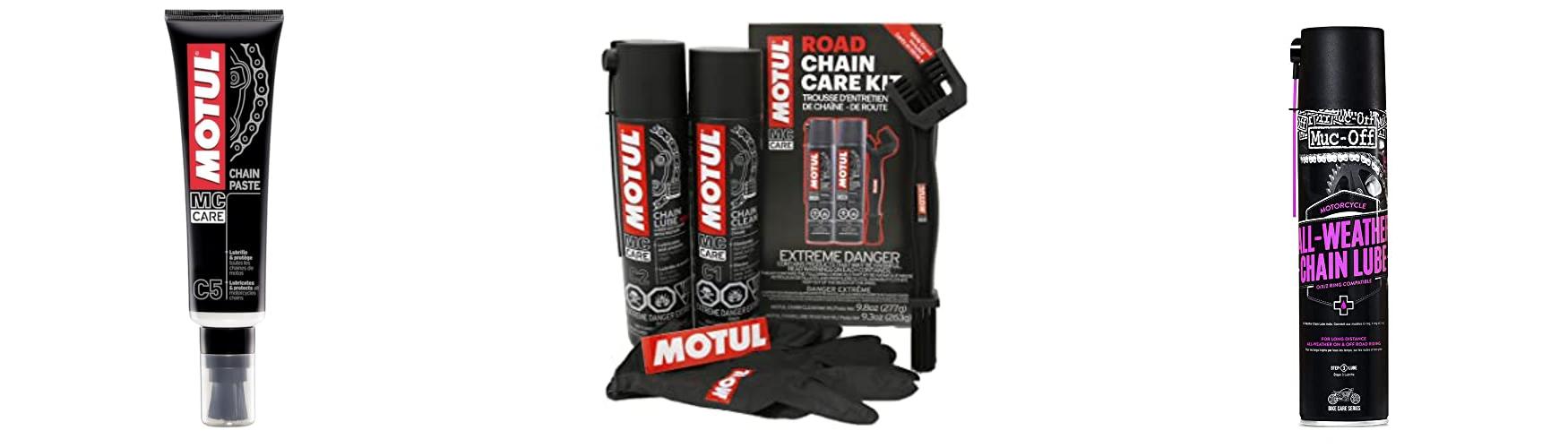 - The kit includes chain cleaner, chain lube for roads, a chain brush, and MOTUL gloves.